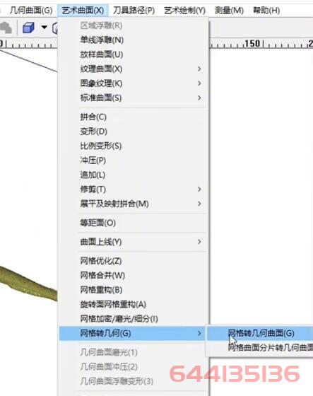 -在菜单栏中选择【艺术曲面】选项,然后找到并点击【网格面转几何曲面】功能。