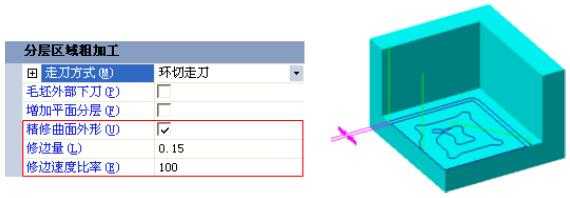 该参数只有选择环切走刀方式时存在,可以通过设置一定的修边量和修边速度比率,有效地改善了粗加工刀具(特别是牛鼻刀)在加工陡峭侧壁时的切削状态,降低切削振动,避免了由于吃刀量过大引起的弹刀现象,同时也提高刀具的耐用度。