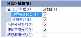 分层区域粗加工提供了三种走刀方式,分别为行切走刀、环切走刀和螺旋走刀。